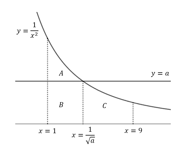 $$\begin{align} & B = a\left(\frac{1}{\sqrt{a}}-1\right) = \sqrt{a}-a \\ & C = \int_{\frac{1}{\sqrt{a}}}^9 \frac{1}{x^2}dx = \sqrt{a} - \frac{1}{9} \end{align}$$