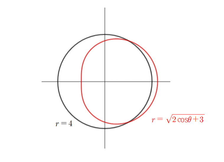 한편 $\theta = 0$에서 $r=\sqrt{2\cos\theta + 3}$이 원점으로부터 더 멀리 떨어져 있으므로