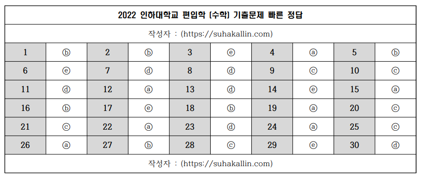 2022 인하대학교 편입수학 기출문제 빠른 정답