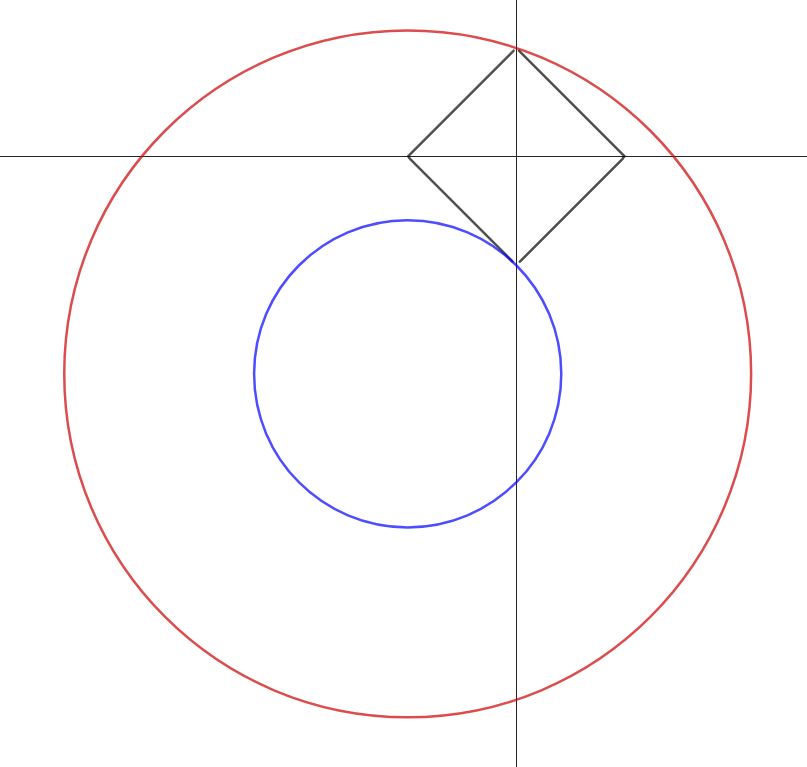 파란색 순간이 최소가 되고 빨간색 순간이 최대가 되는데, 파란 원의 방정식은