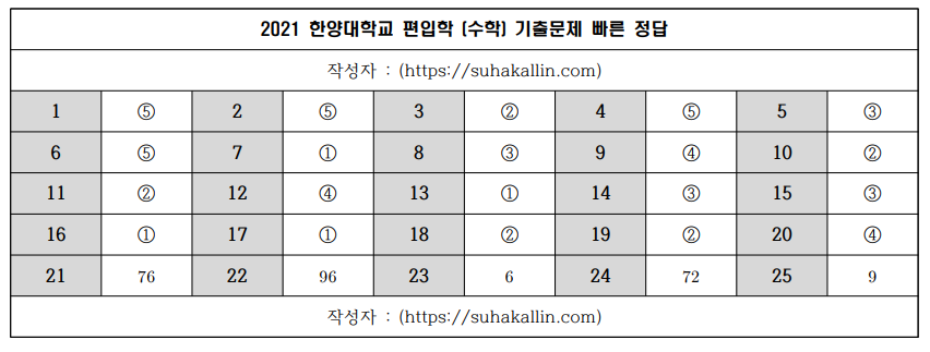 2021 한양대학교 편입수학 기출문제 빠른 정답