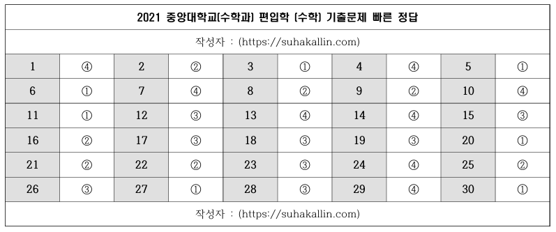 2021 중앙대학교 편입수학 기출문제 빠른 정답