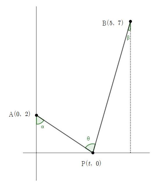 이고 이를 풀면 $t=1$이다. 따라서 우리가 구하는 거리는 두 점