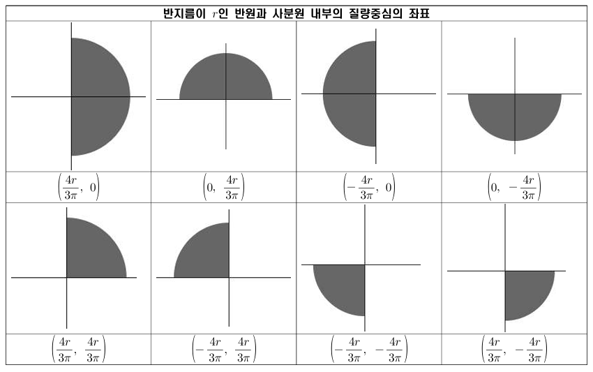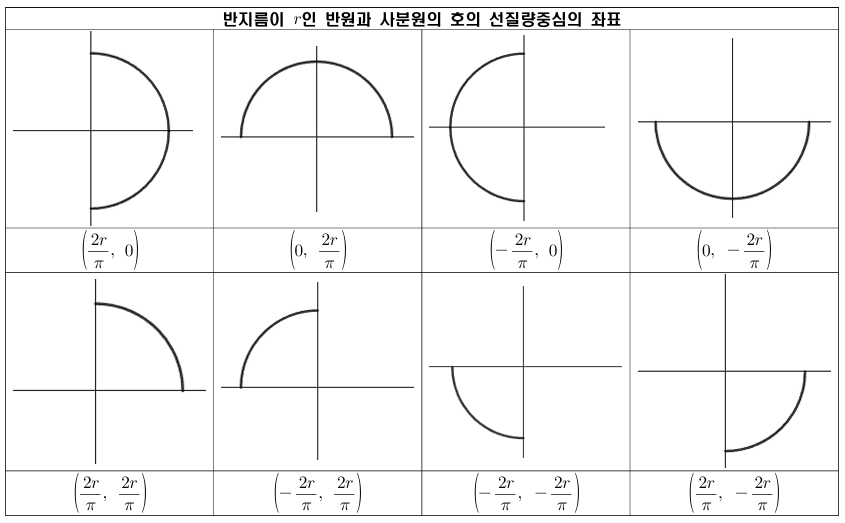 따라서 위에서 얻은 반원 및 사분원 내부의 질량중심을 정리하면 다음과 같습니다.