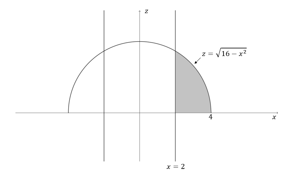 구하는 부피는 아래 사진의 영역을 $z$축을 중심으로 회전하여 얻은