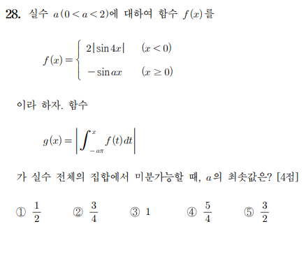 $x>0$에서의 함숫값이 그보다 덜 내려오면 함수 $g(x)$는 미분가능하게 된다.
