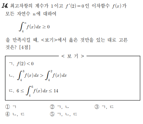 주어진 조건 $g(n)\geq 0$와 모순이다. 따라서 $f(2)<0$이다. (참)