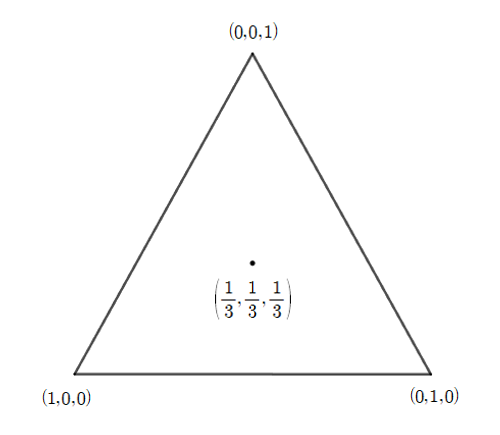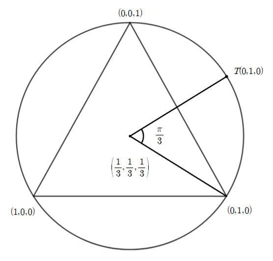 위 그림에서 삼각형의 인접한 두 꼭짓점과 점 $\displaystyle\left( \frac{1}{3} , \frac{1}{3} , \frac{1}{3} \right)$이 이루는 둔각의 크기는 $\frac{2\pi}{3}$임을 기억하자.