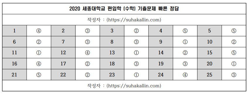 2020 세종대학교 편입수학 기출문제 빠른 정답