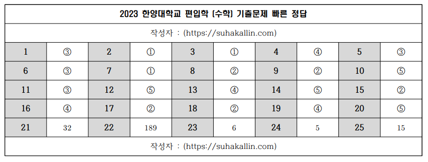 2023 한양대학교 편입수학 기출문제 빠른 정답