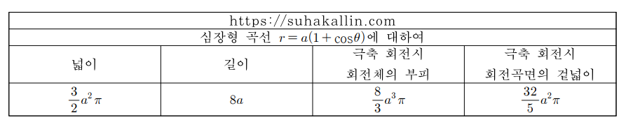[수학] 심장형 곡선의 성질 정리 (넓이, 길이, 접선의 기울기, 회전체의 부피 등등)
