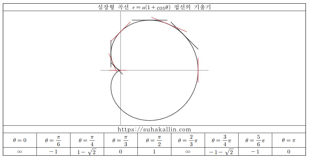 특수각들에 대해 정리한 심장형 곡선의 접선의 기울기는 다음과 같습니다.