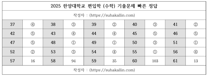 2025 한양대학교 편입수학 기출문제 빠른 정답